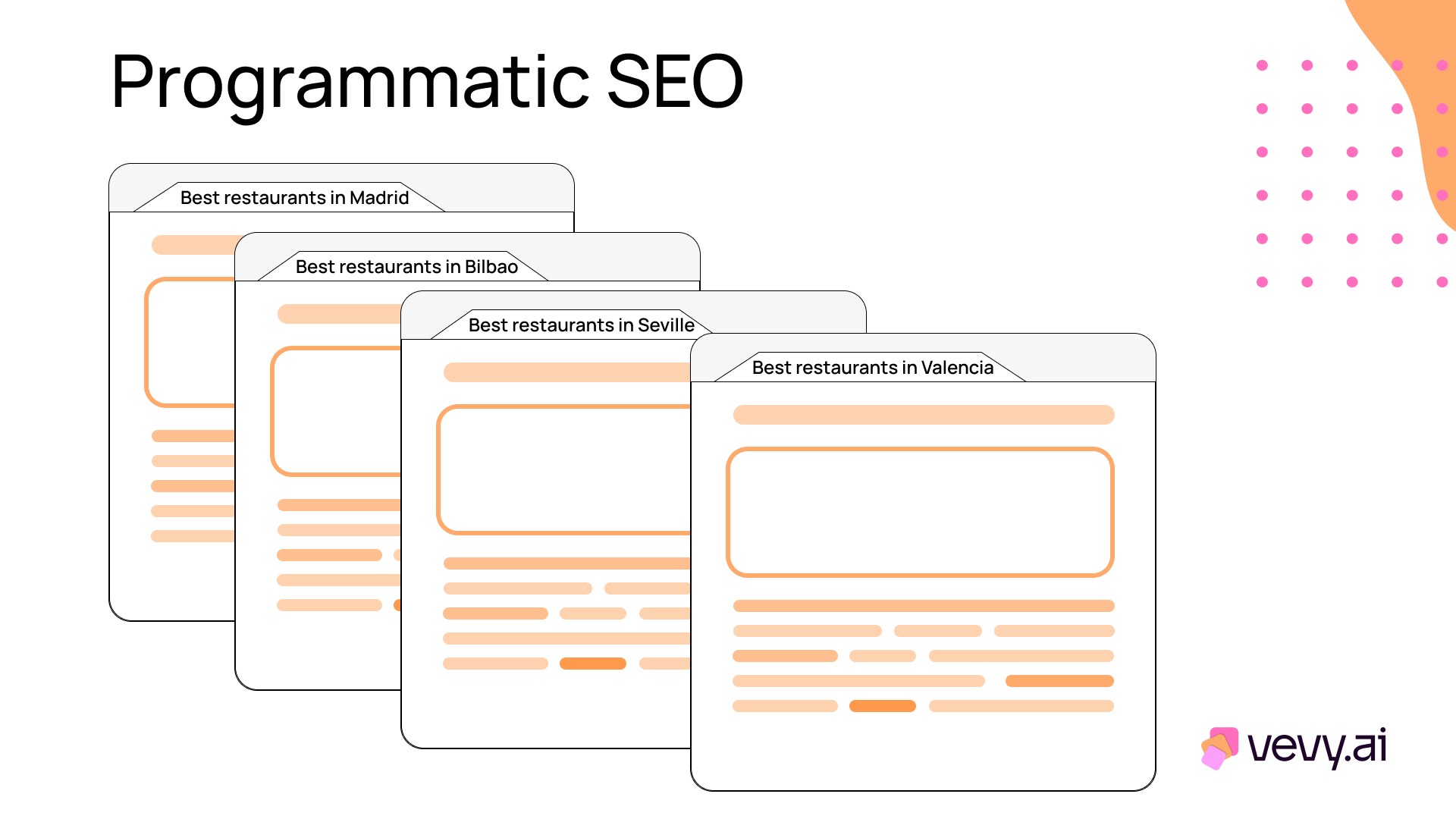 Let's say your product is in the travel niche focused on Spain. You might use programmatic SEO to create pages like “Top X things to do in Madrid,” “Best restaurants in Barcelona,” or “Top X attractions in Valencia,” and similar pages for all cities in Spain.