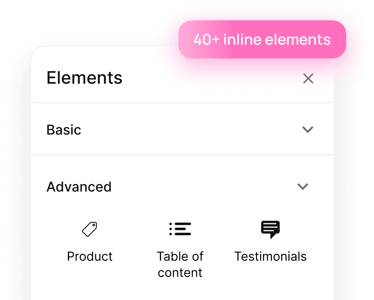 Insert products, FAQs, CTAs and embeds direclty into yoyr content.